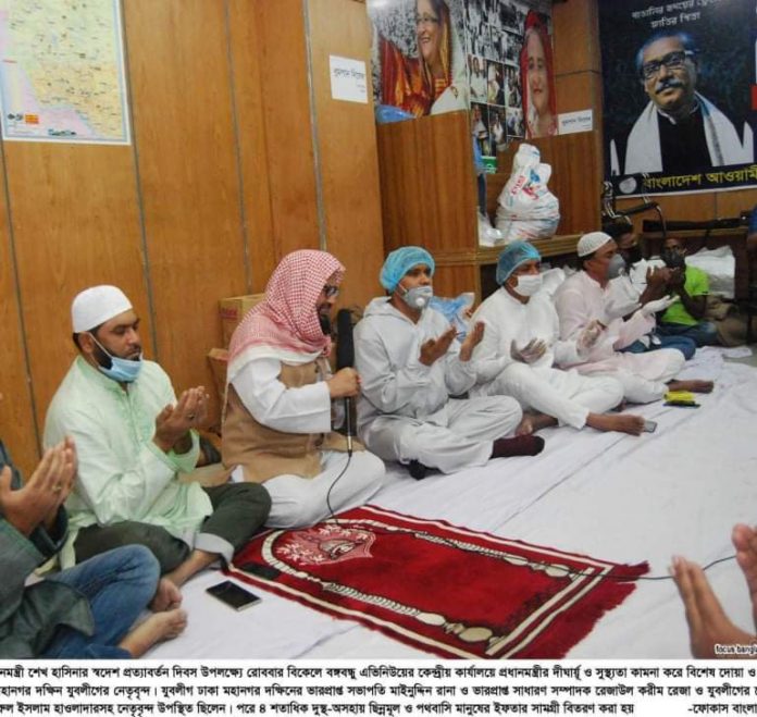 ১৭ মে ( রবিবার) বাদ আছর বাংলাদেশ আওয়ামী লীগ সভাপতি, মাননীয় প্রধানমন্ত্রী রাষ্ট্রনায়ক শেখ হাসিনার স্বদেশ প্রত্যাবর্তন দিবস উপলক্ষে যুবলীগ কেন্দ্রীয় কার্যালয়ে ও মিরপুর ১( শাহ আলী মাজার প্রাঙ্গনে) বাংলাদেশ আওয়ামী যুবলীগ চেয়ারম্যান শেখ ফজলে শামস্ পরশ ও সাধারণ সম্পাদক আলহাজ¦ মোঃ মাইনুল হোসেন খান নিখিল এর নির্দেশে ঢাকা মহানগর দক্ষিন ও উত্তর শাখা পৃথক পৃথক দোয়া মাহফিল অনুষ্ঠিত হয়। এ সময় করোনা ভাইরাসে নিহত ঢাকা মহানগর দক্ষিনাধীন ৫০নং ওয়ার্ড সভাপতি সায়েম খন্দকার এর রুহের মাগফেরাত কামনা করেও দোয়া প্রার্থনা করা হয়।