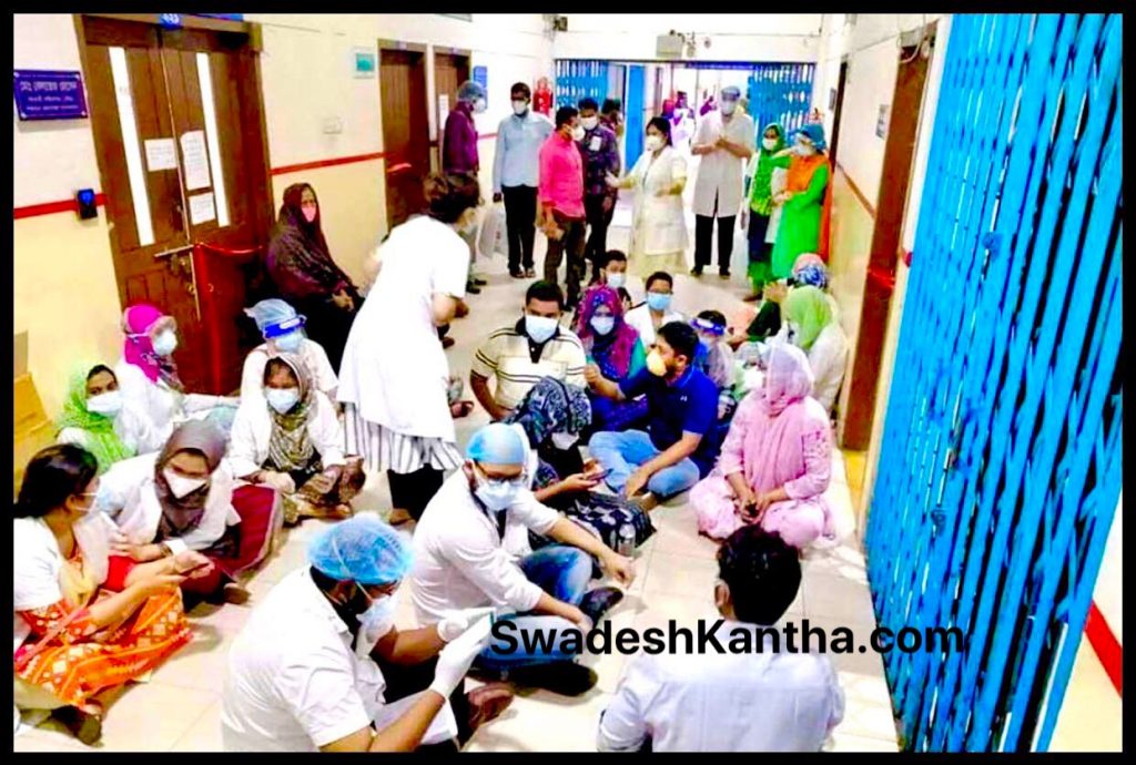 চাকরি স্থায়ীকরণ ও সব চিকিৎসকদের জন্য পর্যাপ্ত সুরক্ষা সামগ্রী নিশ্চিত করাসহ পাঁচ দফা দাবিতে কর্মবিরতিসহ অবস্থান কর্মসূচি পালন করছেন বারডেম জেনারেল হাসপাতালের অস্থায়ী চিকিৎসকরা।
