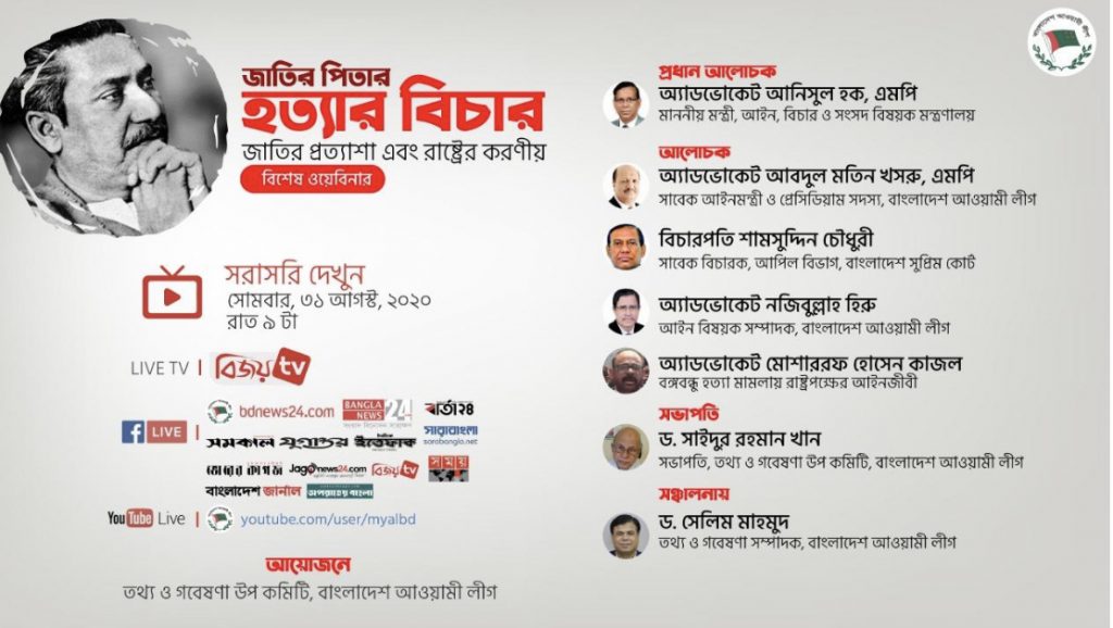 ৩১শে আগস্ট ২০২০ রাত ৯ টায় বাংলাদেশ আওয়ামী লীগ-এর তথ্য ও গবেষণা উপ কমিটি আয়োজন করতে যাচ্ছে বিশেষ ভার্চুয়াল ওয়েবিনার ‘জাতির পিতার হত্যার বিচারঃ জাতির প্রত্যাশা এবং রাষ্ট্রের করণীয়’ বিষয়ক আলোচনা অনুষ্ঠান।