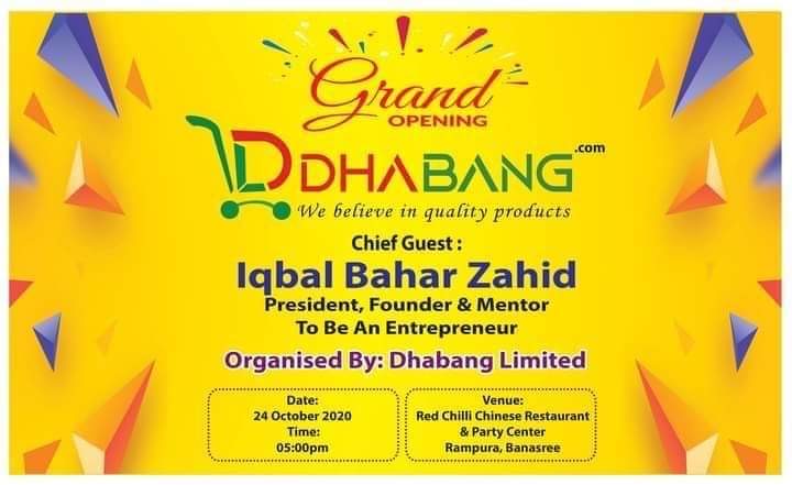 ঢাবাং লিমিটেড কোম্পানির নতুন প্রকল্প ই-কমার্স মার্কেট প্লেস www.dhabang.com ফাইনালি শুভ উদ্ভোধন হতে যাচ্ছে আগামী ২৪শে অক্টোবর রোজঃ শনিবার সময় বিকাল ৫ ঘঠিকায়। শুভ উদ্ভোধন করবেন Honorable Chief Guest প্রিয় মেন্টর জনাব ইকবাল বাহার জাহিদ স্যার । ঢাবাং লিমিটেড কোম্পানির বর্তমান পণ্য চায়ের পাশাপাশি ই-কমার্স মার্কেট প্লেস নিয়ে আসছে। দেশের সেরা ই-কমার্স মার্কেট প্লেস।