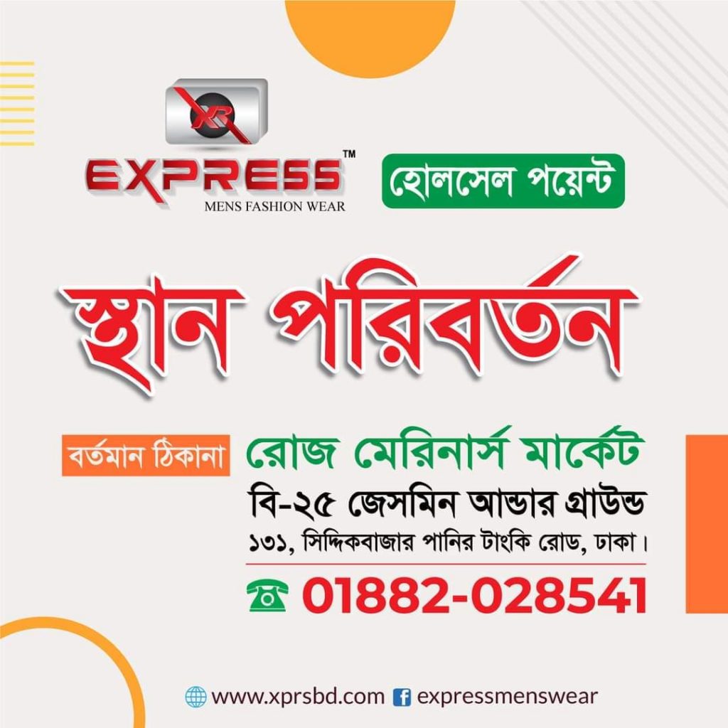 স্থান পরিবর্তন । Express এখন রোজ মেরিনার্স মার্কেট এর আন্ডার গ্রাউন্ডে দোকান নং-বি-25 জেসমিন, 131 সিদ্দিক বাজার পানি টাংকি রোড, ঢাকা। ব্রাঞ্চ ম্যানেজার মোঃ আবু সাঈদ মোবাঃ 01882028541