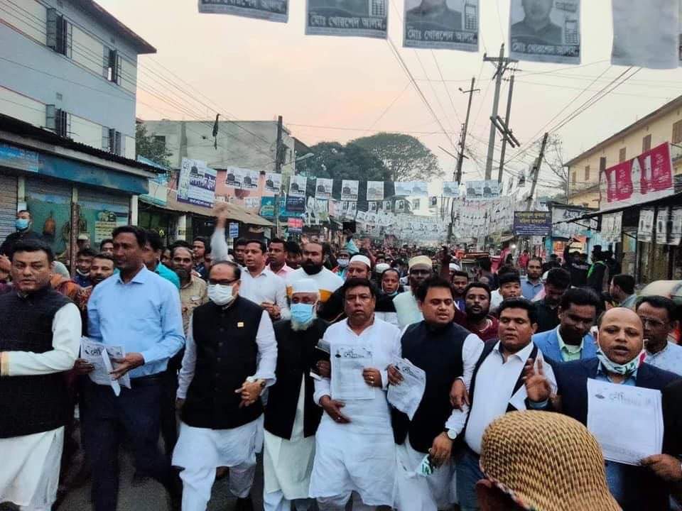 নোয়াখালী জেলার সোনাইমুড়ী পৌরসভা নির্বাচনে বাংলাদেশ আওয়ামী লীগ মনোনীত মেয়র পদপ্রার্থী ভিপি নুরুল হক চৌধুরী’র নৌকা প্রতিকের পক্ষে নির্বাচনী প্রচারণা ও গণসংযোগ চালিয়ে কেন্দ্রীয় যুবলীগের নেতারা।