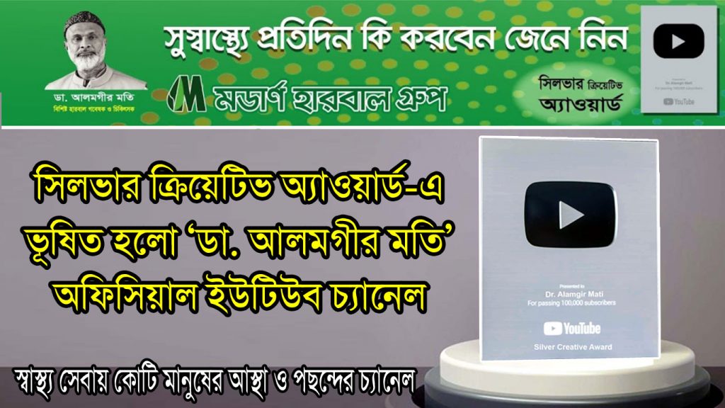 নিউজ ডেস্ক, স্বদেশ কন্ঠ, সম্পাদনায়, আরজে সাইমুর: সিলভার ক্রিয়েটিভ অ্যাওয়ার্ড-এ ভূষিত হলেন `ডা. আলমগীর মতি’ অফিসিয়াল ইউটিউব চ্যানেল। বিশ্বব্যাপী ইউটিউবের জয় জয়কার। ১ লক্ষ সাবস্ক্রাইবার অতিক্রম করলেই সিলভার ক্রিয়েটিভ অ্যাওয়ার্ড তথা সিলভার প্লে বাটন প্রদান করে ইউটিইব কর্তৃপক্ষ। `ডা. আলমগীর মতি’ ইউটিউব ভেরিফাইড চ্যানেল স্বাস্থ্য সেবায় কোটি মানুষের আস্থা ও পছন্দের চ্যানেল। প্রতিদিন বিনা ভিজিটে স্বাস্থ্য বিষয়ক তথ্য ও ফ্রি চিকিৎসা পরামর্শ দিয়ে ভিডিও প্রকাশিত হচ্ছে। জনপ্রিয় ভিডিও প্লাটফম ইউটিউবের মাধ্যমে সাধারণ মানুষ দেশ ও দেশের বাইরে পৃথিবীর বিভিন্ন প্রান্ত থেকে ‘ডা. আলমগীর মতি’ ইউটিউব চ্যানেলে স্বাস্থ্য, খাদ্য, পথ্য ও ঔষধ বিষয়ক বিভিন্ন রোগের উপশম, সমস্যার সমাধান ও পরামর্শ পেয়ে থাকেন। প্রতিদিনই হাজার হাজার সাধারণ মানুষ তাদের রোগ ও স্বাস্থ্য বিষয়ক বিভিন্ন সমস্যার সমাধান চেয়ে প্রশ্ন ইমেইল ও কমেন্ট করে জানিয়ে থাকে। পরবর্তীতে `ডা. আলমগীর মতি’ ইউটিউব চ্যানেলের মাধ্যমে তাদের সমস্যার সমাধান সম্বলিত ভিডিও প্রকাশ হয়। উল্লেখ্য ডা. আলমগীর মতি ইউটিউব চ্যানেল থেকে উর্পাজিত সম্পূর্ণ অর্থ অসহায় মানুষের চিকিৎসা সেবা ও সাহায়তায় ব্যয় করা হয়। বাংলাদেশ হোমিওপ্যাথিক মেডিকেল এসোসিয়েশনের প্রেসিডেন্ট, মডার্ণ হারবাল গ্রুপের চেয়ারম্যান, ঢাকা শরীয়তপুর সেন্ট্রাল লায়ন্স আই হাসপাতালের প্রতিষ্ঠাতা বিশিষ্ট হারবাল গবেষক ও চিকিৎসক লায়ন ডাঃ আলমগীর মতি এমজেএফ। ঢাকা শরীয়তপুর সেন্ট্রাল লায়ন্স আই হাসপাতাল পৃথিবীর ৩০০টি চক্ষু হাসপাতালের মধ্যে ইনফেকশন বিহীন চক্ষু সেবায় ৬ষ্ঠ স্থান অর্জন করে লায়ন্স হেড কোয়াটার ‘এলসিএফ’ স্বর্ণ পদকে ভূষিত হয়। মানব সেবায় বিশেষ অবদানের জন্য ডাঃ আলমগীর মতি ইতোপূর্বে দেশি ও আন্তর্জাতিক পর্যায়ে বিভিন্ন পদকে ভূষিত হয়েছেন। হারবাল গবেষণার অনন্য অবদানের জন্য আন্তর্জাতিক পুরস্কার লাভ করে ড. আলমগীর মতি দেশের ভাবমূর্তি উজ্জ্বল করেছেন। হারবাল চিকিৎসা ও গবেষণায় নিবেদিত ডাঃ আলমগীর মতি হারবাল চিকিৎসাকে আন্দোলনের রূপ দিয়েছেন। তিনি মডার্ণ হারবাল গ্রুপ এর প্রতিষ্ঠাতা চেয়ারম্যান। একজন টিভি ব্যক্তিত্ব হিসেবে চ্যানেলে নিয়মিত হারবাল খাদ্য ও চিকিৎসার ওপর আলোচনা করেন। ডা. আলমগীর মতি পরিচালিত মডার্ণ হারবাল গ্রুপ ৩৯ বছর ধরে বিনা ভিজিটে মানব সেবায় কাজ করে যাচ্ছে। তিনি টিভি চ্যানেল, ইউটিউব, ফেসবুক, টুইটার, ইন্সটাগ্রামসহ বিভিন্ন সোশ্যাল মিডিয়াতে স্বাস্থ্য সুরক্ষায় চিকিৎসা ও পরামর্শ দিয়ে আসছেন। সাধারণ মানুষ তার এই ভিজুয়াল চিকিৎসা পরামর্শে উপকৃত হচ্ছে। সারা বিশ্বে তার এই চিকিৎসা পরামর্শ মানুষ শুনছ