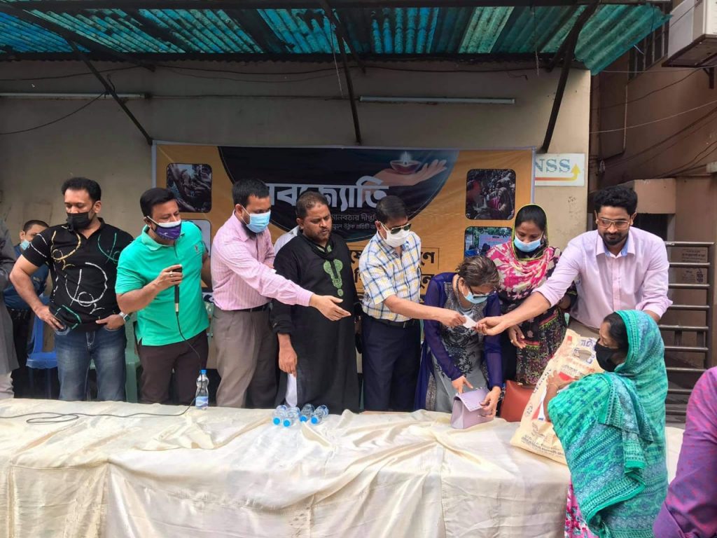 নবজ্যোতি ফাউন্ডেশন প্রতিটি পরিবারকে পাঁচ কেজি চাল, দুই কেজি আলু, তিন কেজি পেঁয়াজ এবং এক কেজি করে তেল, ডাল ও লবণ বিতরণ করে।