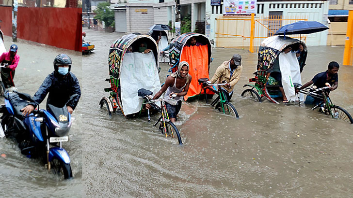 প্রবল বৃষ্টিতে নগরীর প্রধান সড়কেও বুক সমান পানি।